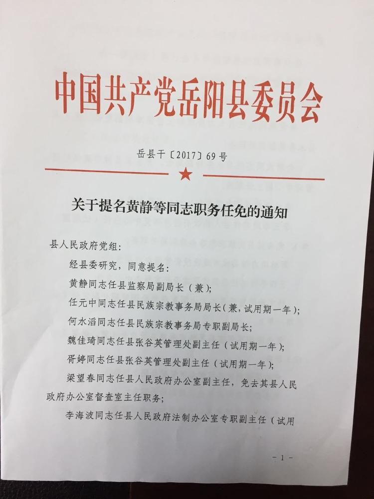 關(guān)于提名黃靜等同志職務(wù)任免的通知