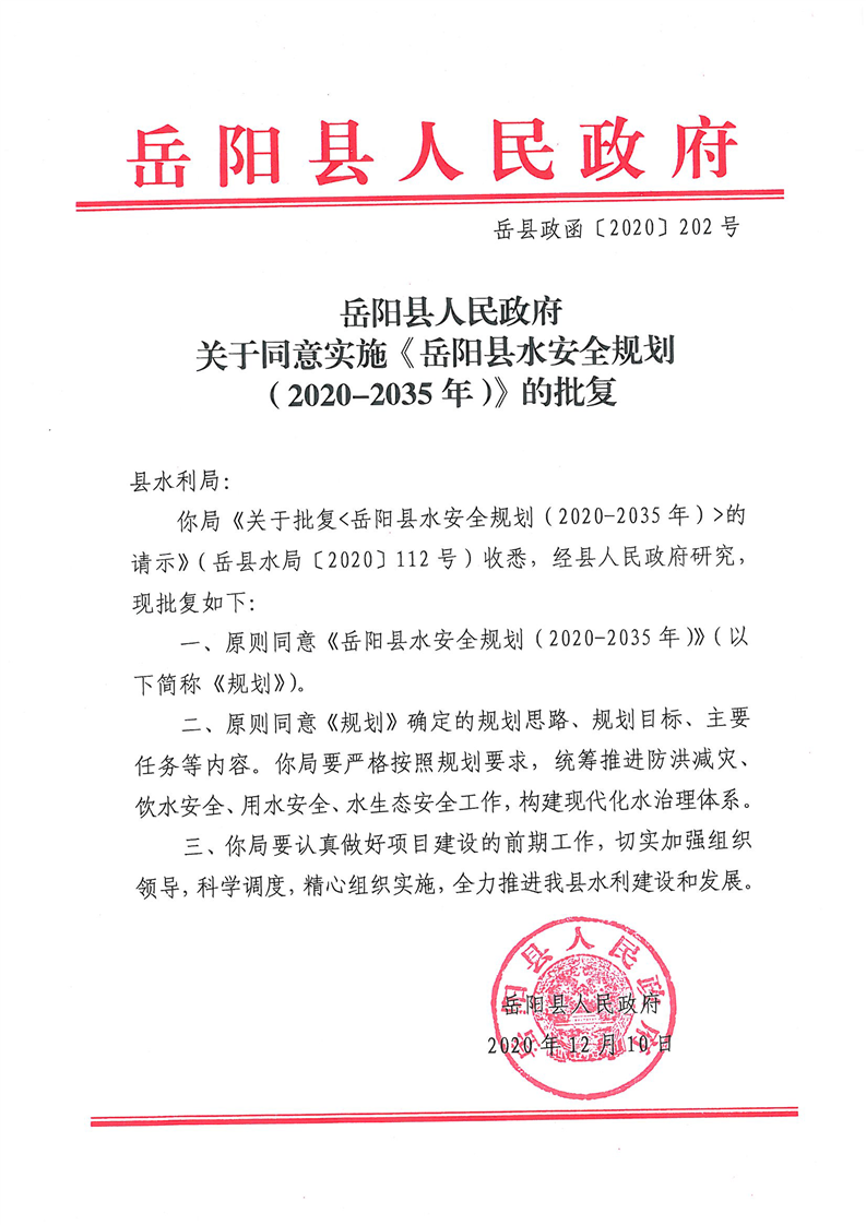 岳陽縣人民政府關于同意實施《岳陽縣水安全規(guī)劃(2020-2035年)》的批復