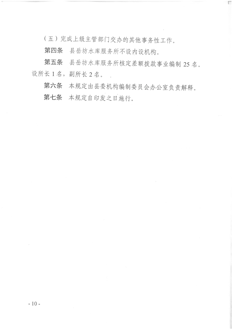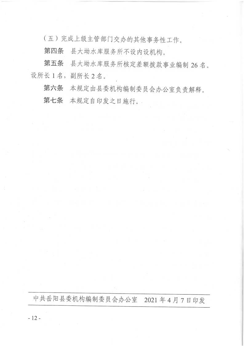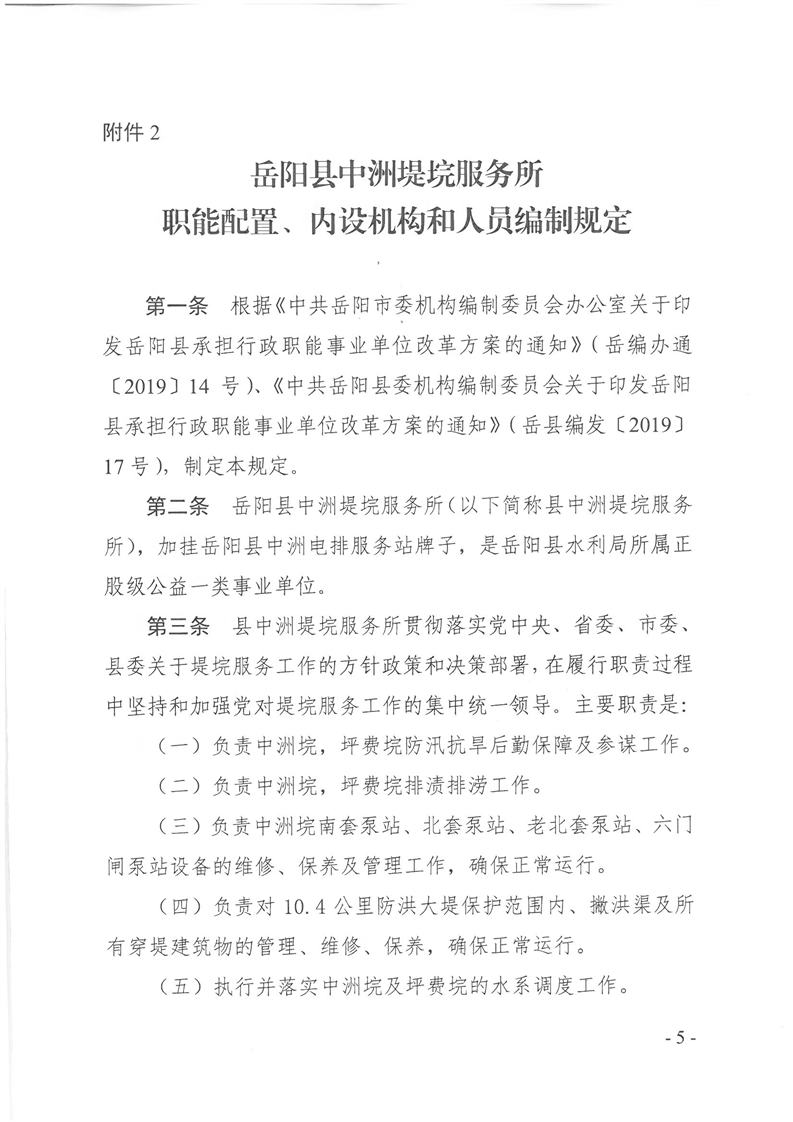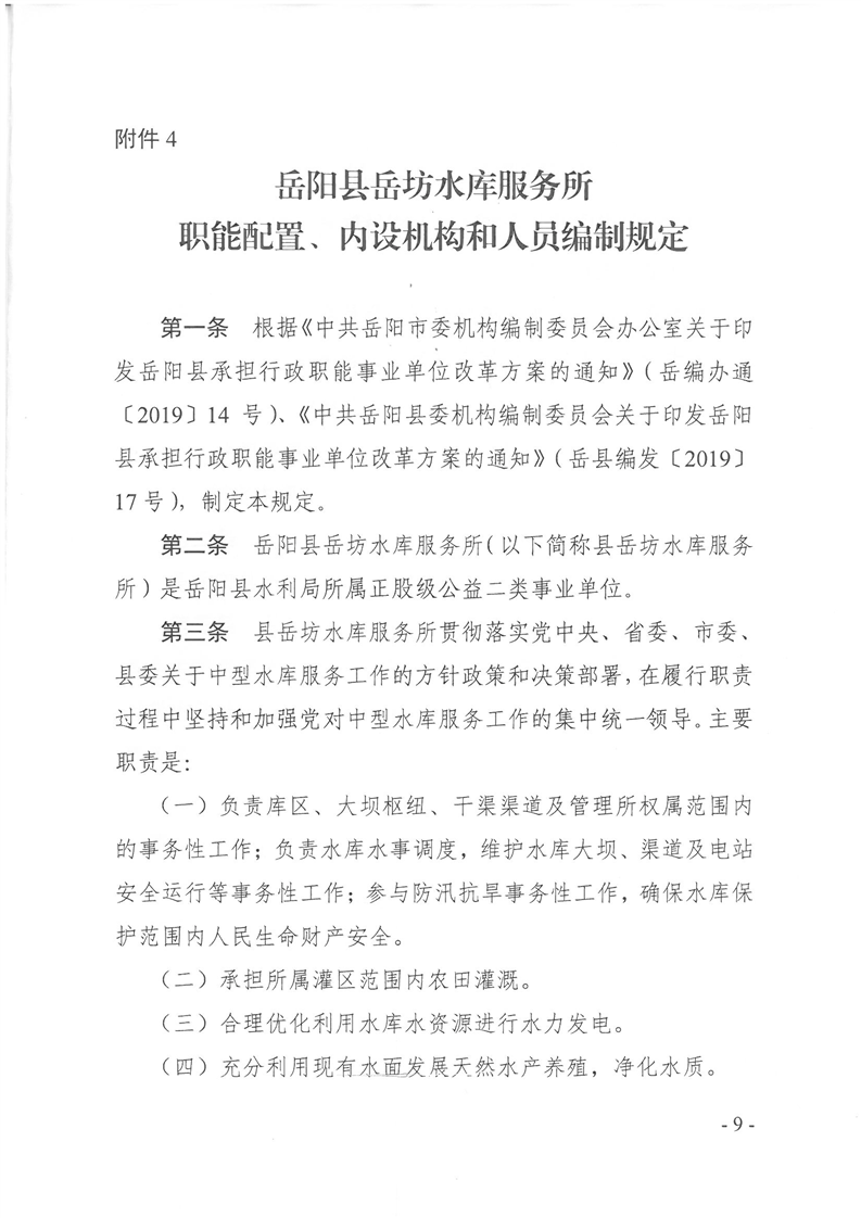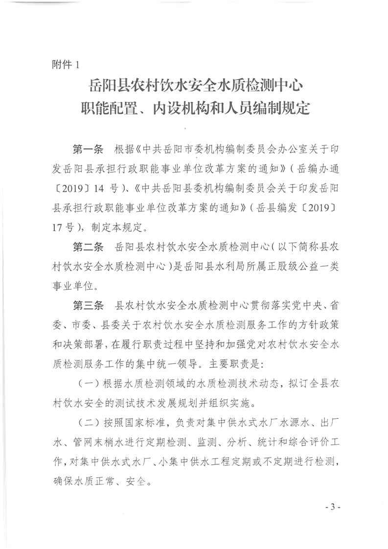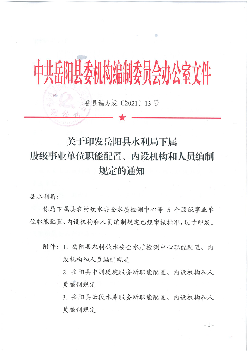 岳陽縣農(nóng)村安全水質(zhì)檢測中心、岳陽縣中洲堤垸服務(wù)所、岳陽縣云段水庫服務(wù)所、岳陽縣岳坊水庫服務(wù)所、岳陽縣大坳水庫服務(wù)所職能配置、內(nèi)設(shè)機(jī)構(gòu)和人員編制規(guī)定