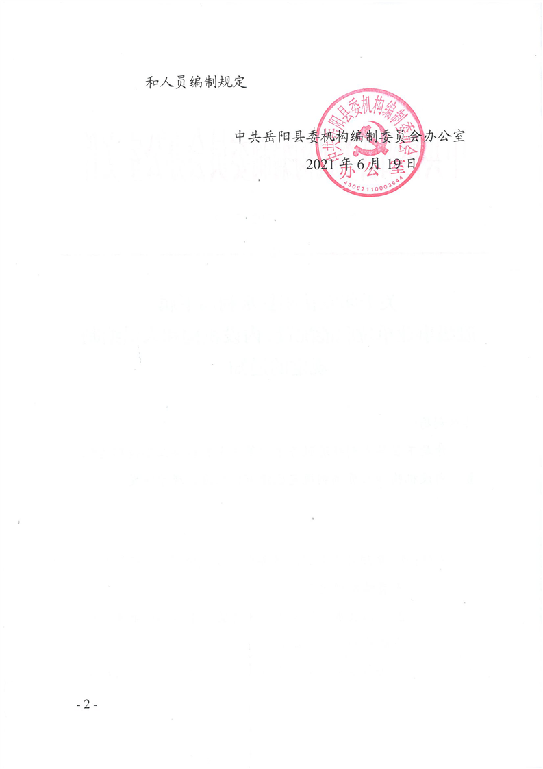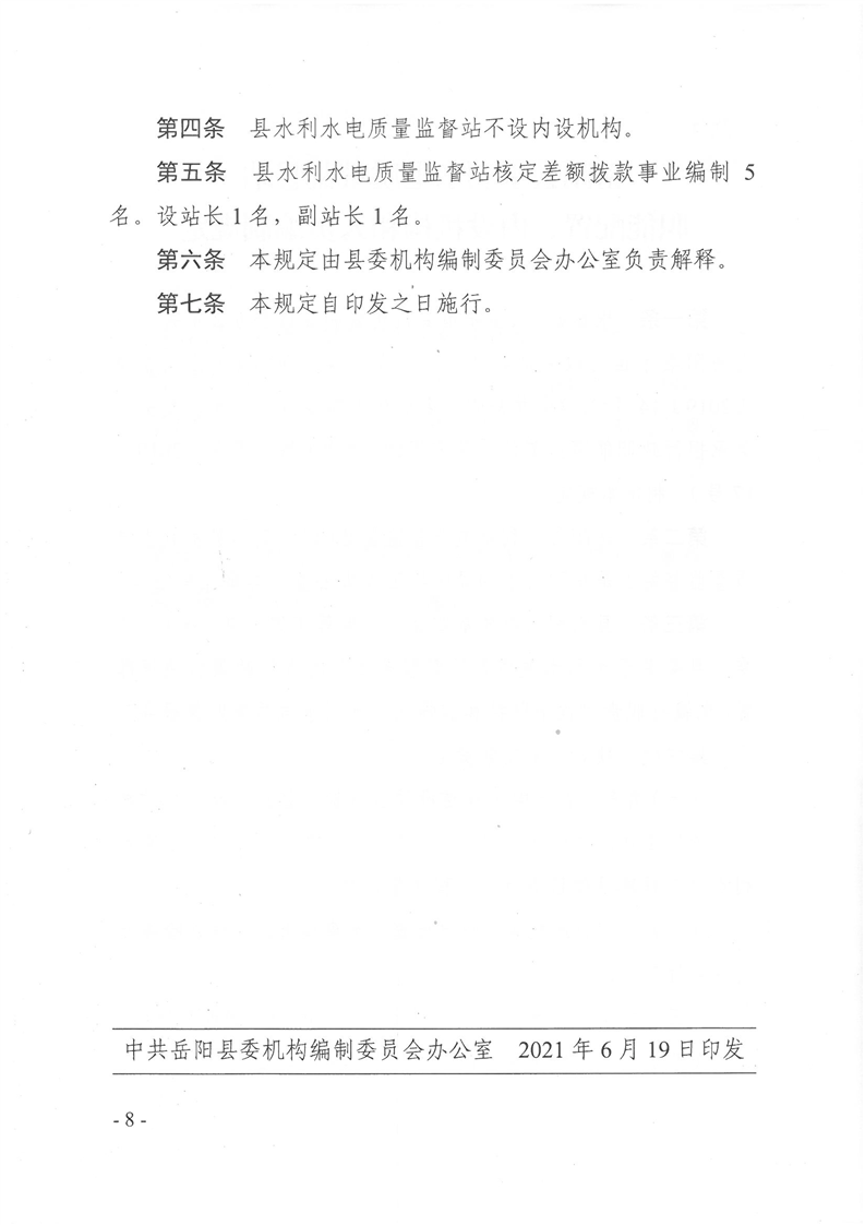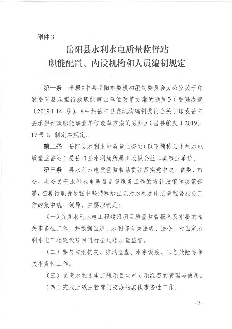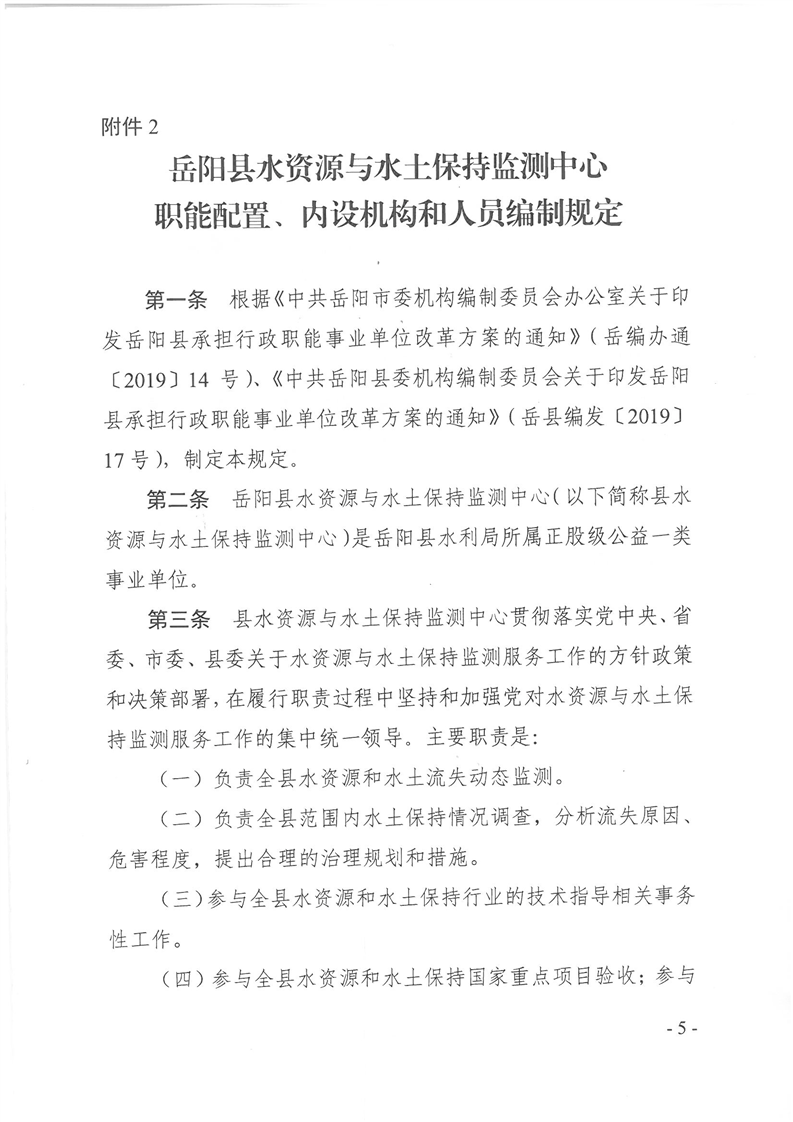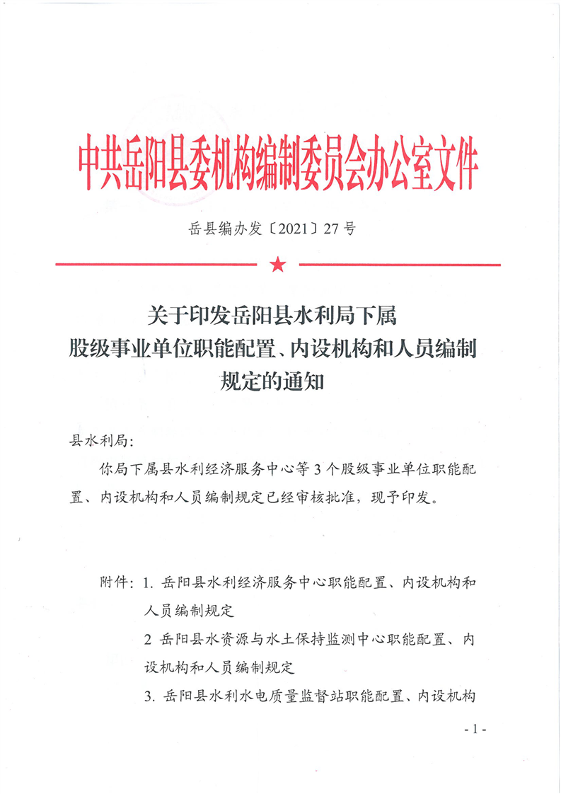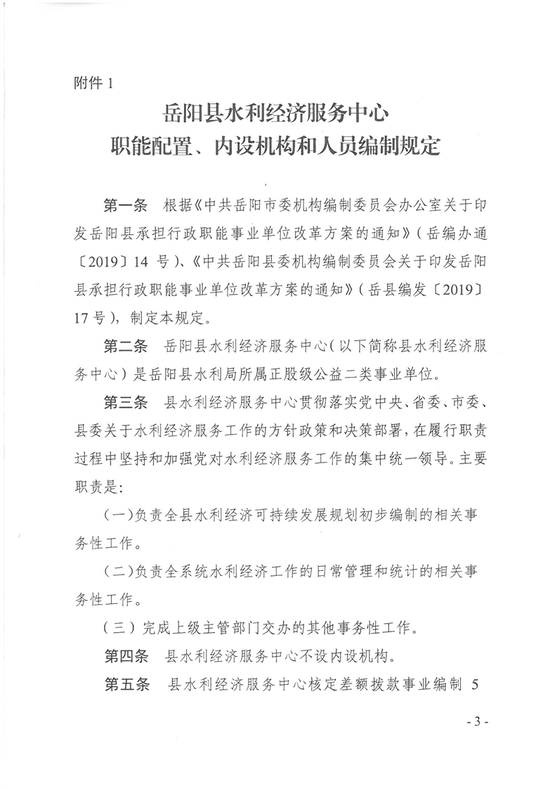 岳陽(yáng)縣縣水利經(jīng)濟(jì)服務(wù)中心、岳陽(yáng)縣水資源與水土保持監(jiān)測(cè)中心、岳陽(yáng)縣水利水電質(zhì)量監(jiān)督站職能配置、內(nèi)設(shè)機(jī)構(gòu)和人員編制規(guī)定