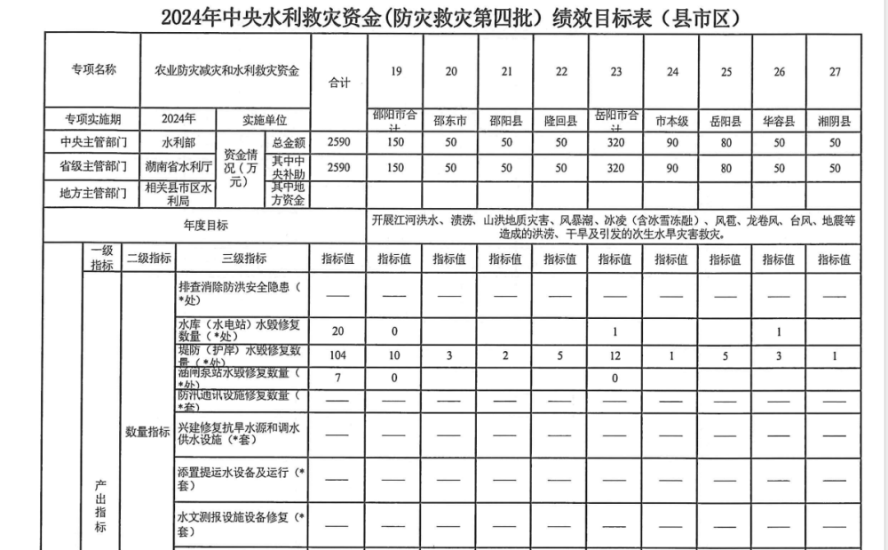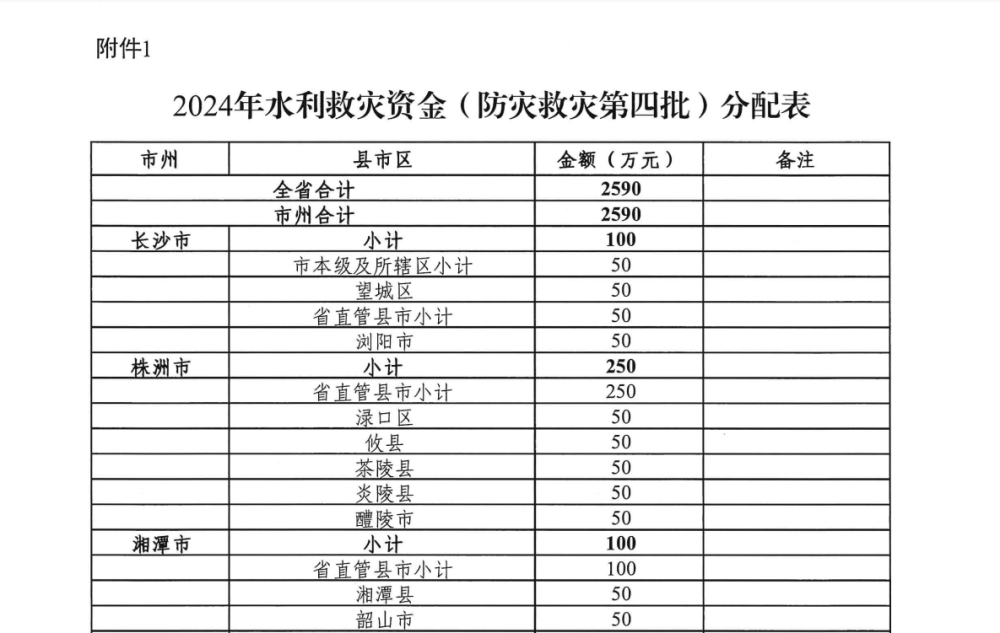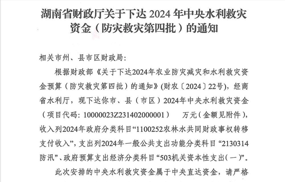 湖南省財(cái)政廳關(guān)于下達(dá)2024年中央水利救災(zāi)資金的通知