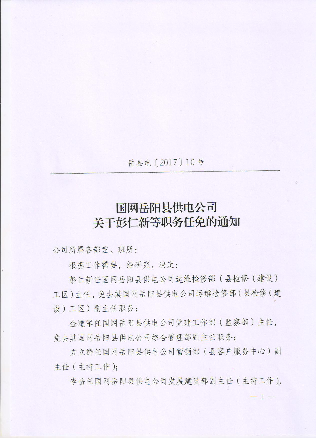 國網(wǎng)岳陽縣供電公司關(guān)于彭仁新等職務(wù)任免的通知