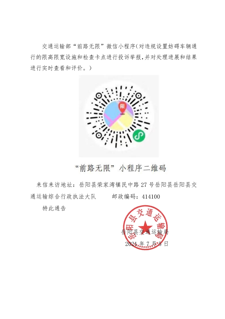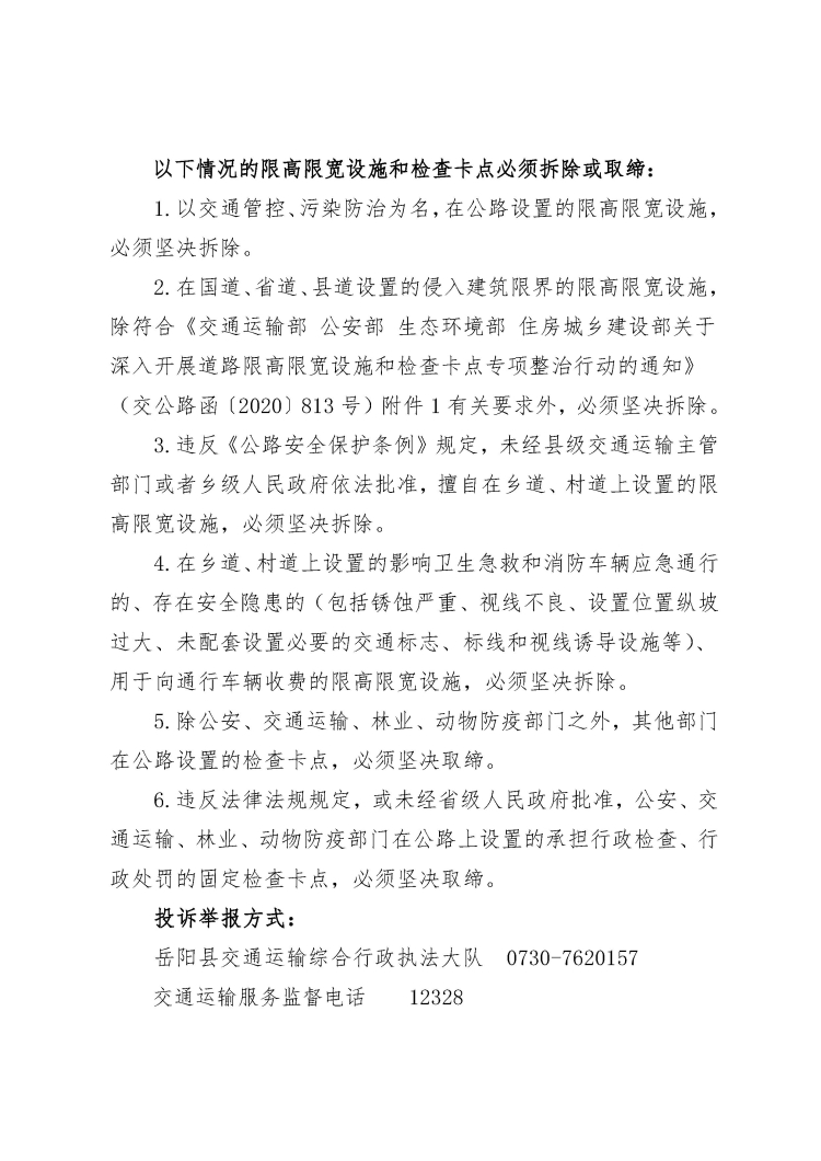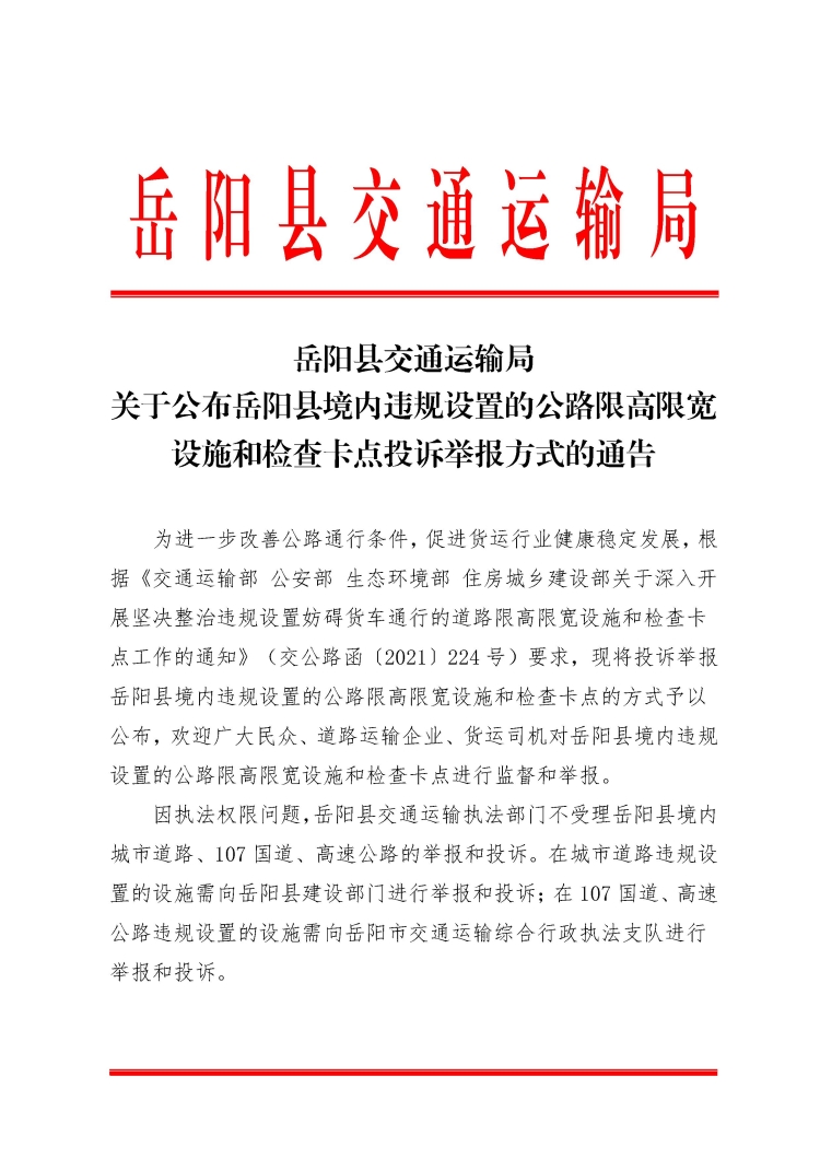 岳陽縣交通運(yùn)輸局關(guān)于公布岳陽縣境內(nèi)違規(guī)設(shè)置的公路限高限寬設(shè)施和檢查卡點(diǎn)投訴舉報(bào)方式的通告