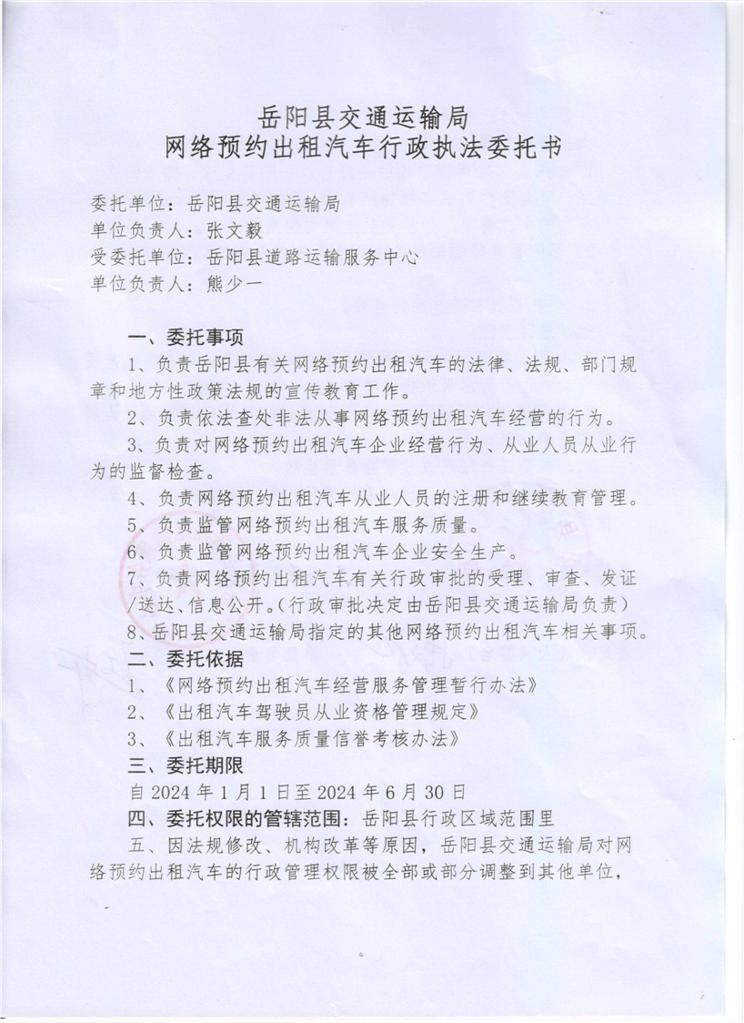 岳陽(yáng)縣交通運(yùn)輸局網(wǎng)絡(luò)預(yù)約出租汽車行政執(zhí)法委托書(shū)