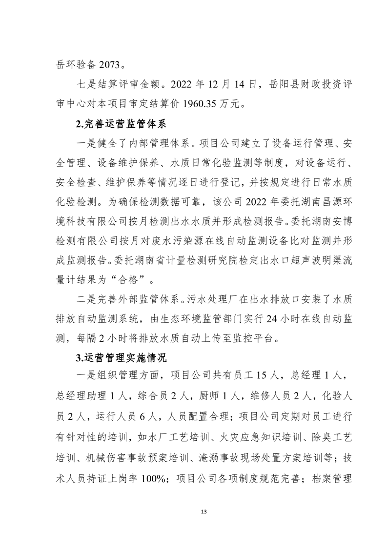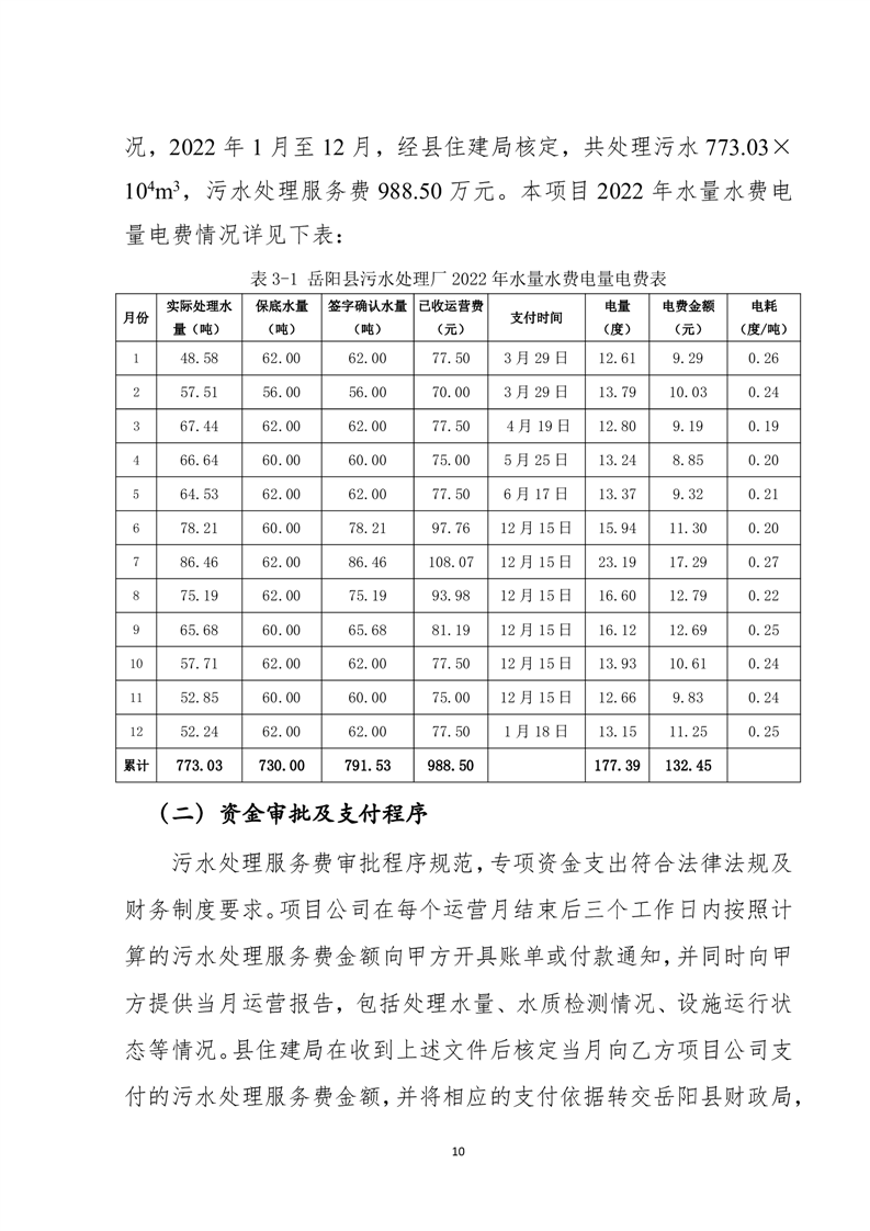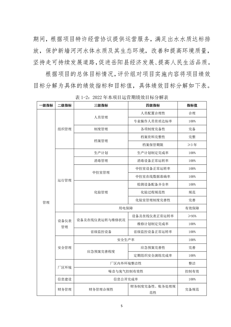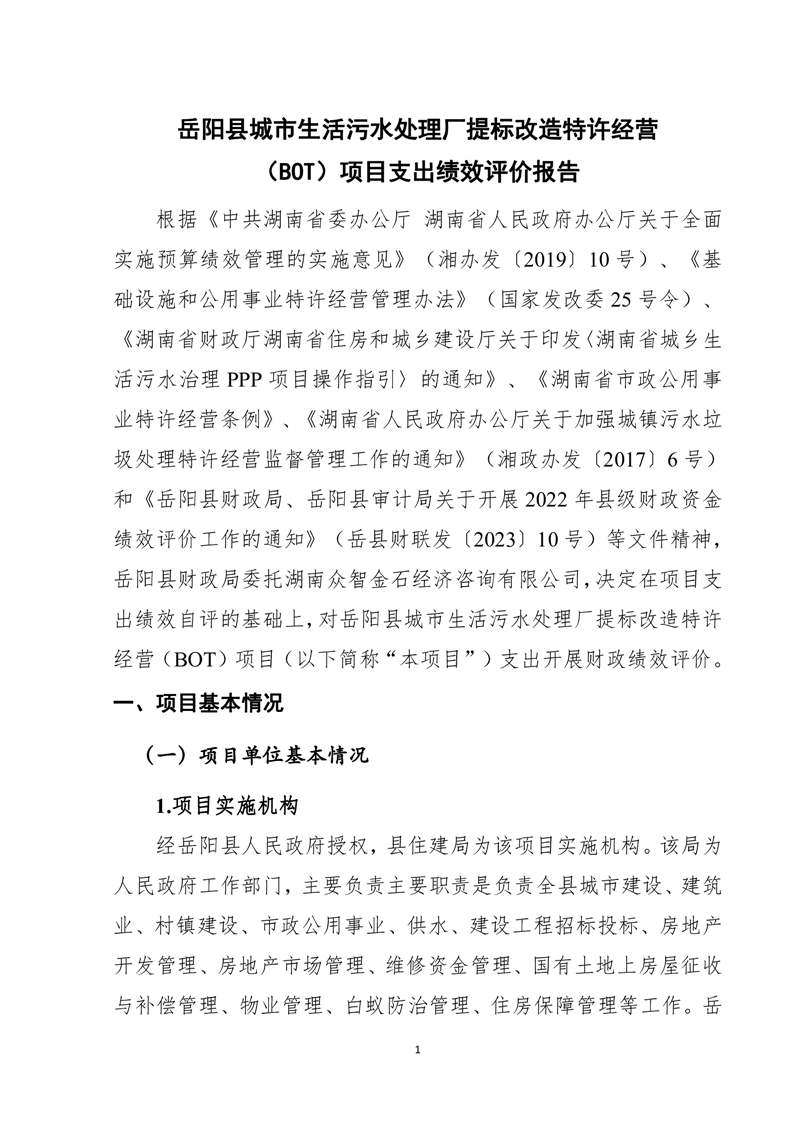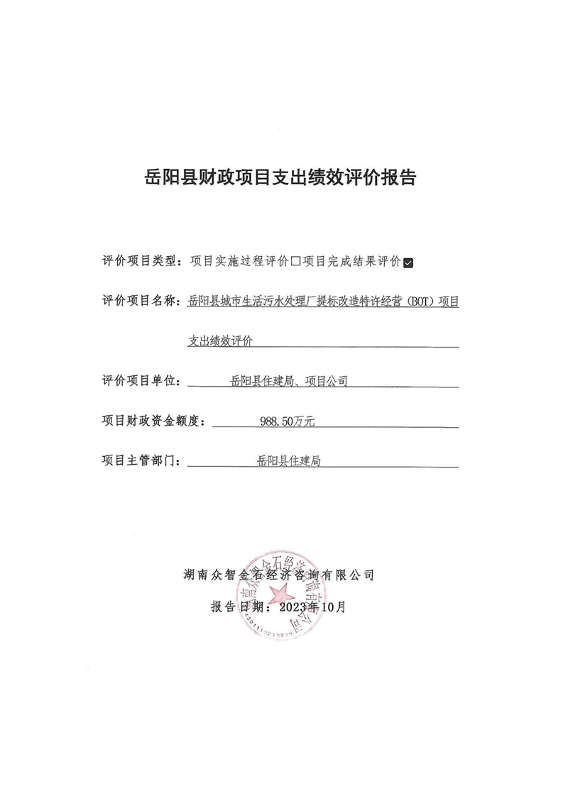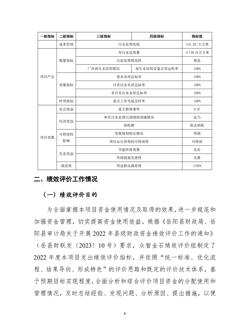 岳陽縣2022年城市生活污水處理廠運營期項目支出績效評價報告